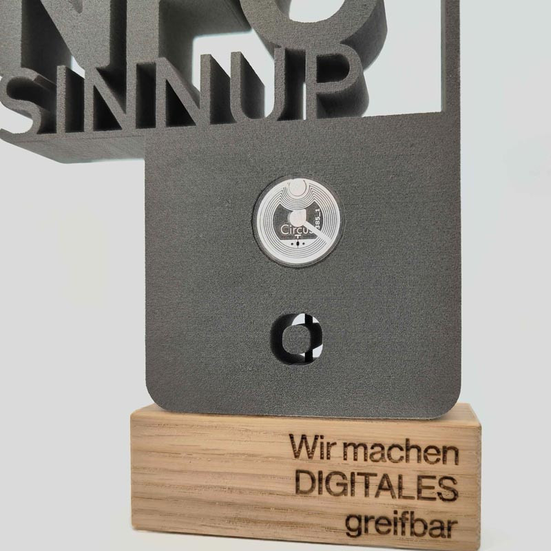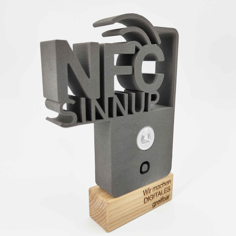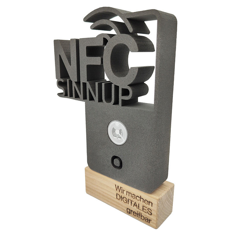 Ein 3D Firmenlogo mit NFC Funktion, als 3D Aufsteller in Szene gesetzt. Holz mit Lasergravur als Standfuß verklebt. Dieses Beispiel hat ein Format von 120 x 140 x25mm