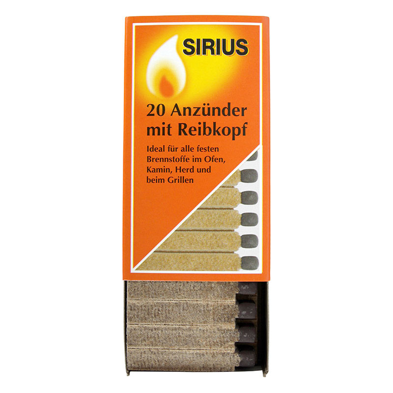 20 Stück Zündhölzer mit Reibkopf in der Kartonverpackung. Die Anzünder sind ideal zum Entzünden von festen Brennstoffen im Ofen, Kamin, Herd und beim Grillen. Durch den individuellen Aufkleber das ideale Werbemittel auch in kleineren Mengen (ab 133 Stück erhältlich).