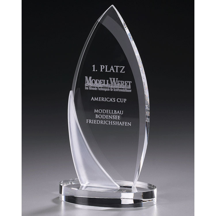 Die ovale, spitz zulaufende Kristallglastrophäe wird mit einem satinierten Glaselement und edlem Diamantschliff zu einem wahren Prachtstück verfeinert. Eine Kombination die durch edles Design und kristallklares Glas hervorsticht.