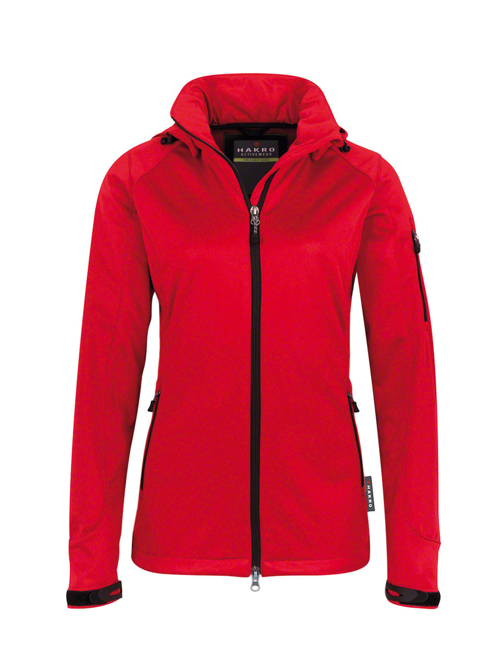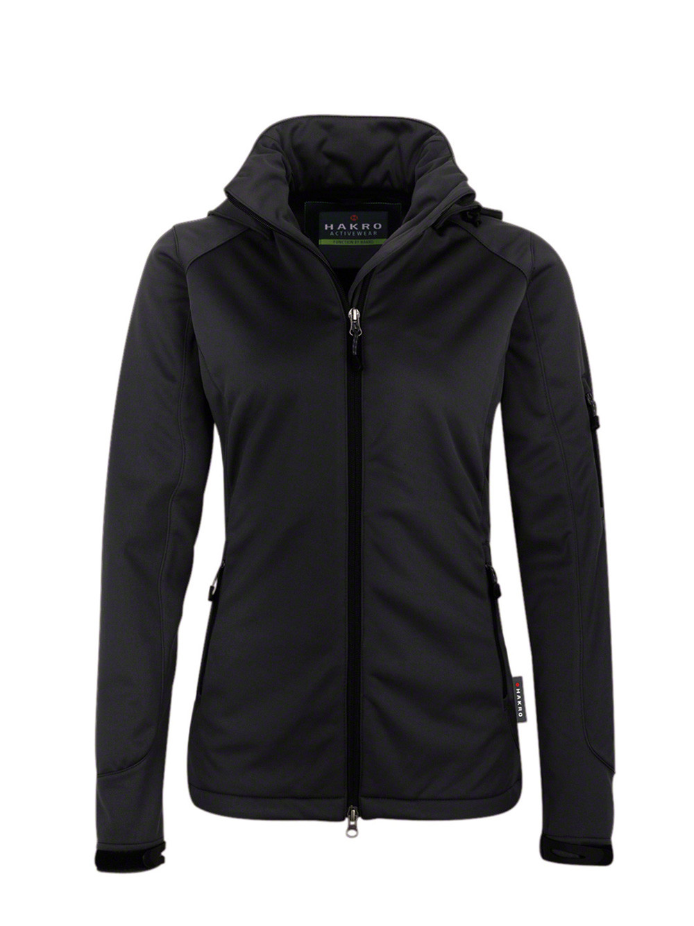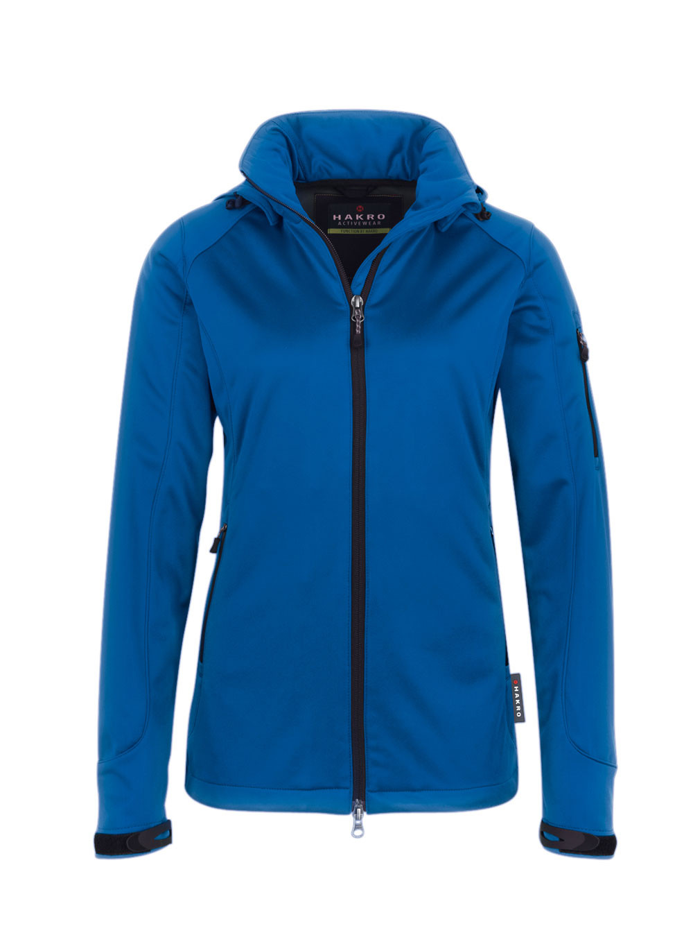 Wärmende, atmungsaktive, strapazierfähige, wasser- und winddichte Softshelljacke für Damen mit abnehmbarer Kapuze, weitenverstellbarem Saumabschluss mit Tunnelkordelzug und Stoppern, verlängertem, abgerundetem Rückenteil, leichtem Microfleece an der Innenseite, Klettbändern an den Ärmelabschlüssen zum stufenlosen Regulieren, hochwertigem 2-Wege-Frontreißverschluss mit innenliegender Windschutzpatte und Kinnschutz, Reißverschlusstasche am linken Ärmel und seitlichen Reißverschlusstaschen. Aus dehnfähigem Softshell-Material hergestellt für exzellente Bewegungsfreiheit aus Interlock-3-Lagen-Laminat mit TRIACTIVE®PRO-Technologie. Gewebtes HAKRO-Flaglabel an der linken Seitennaht.
