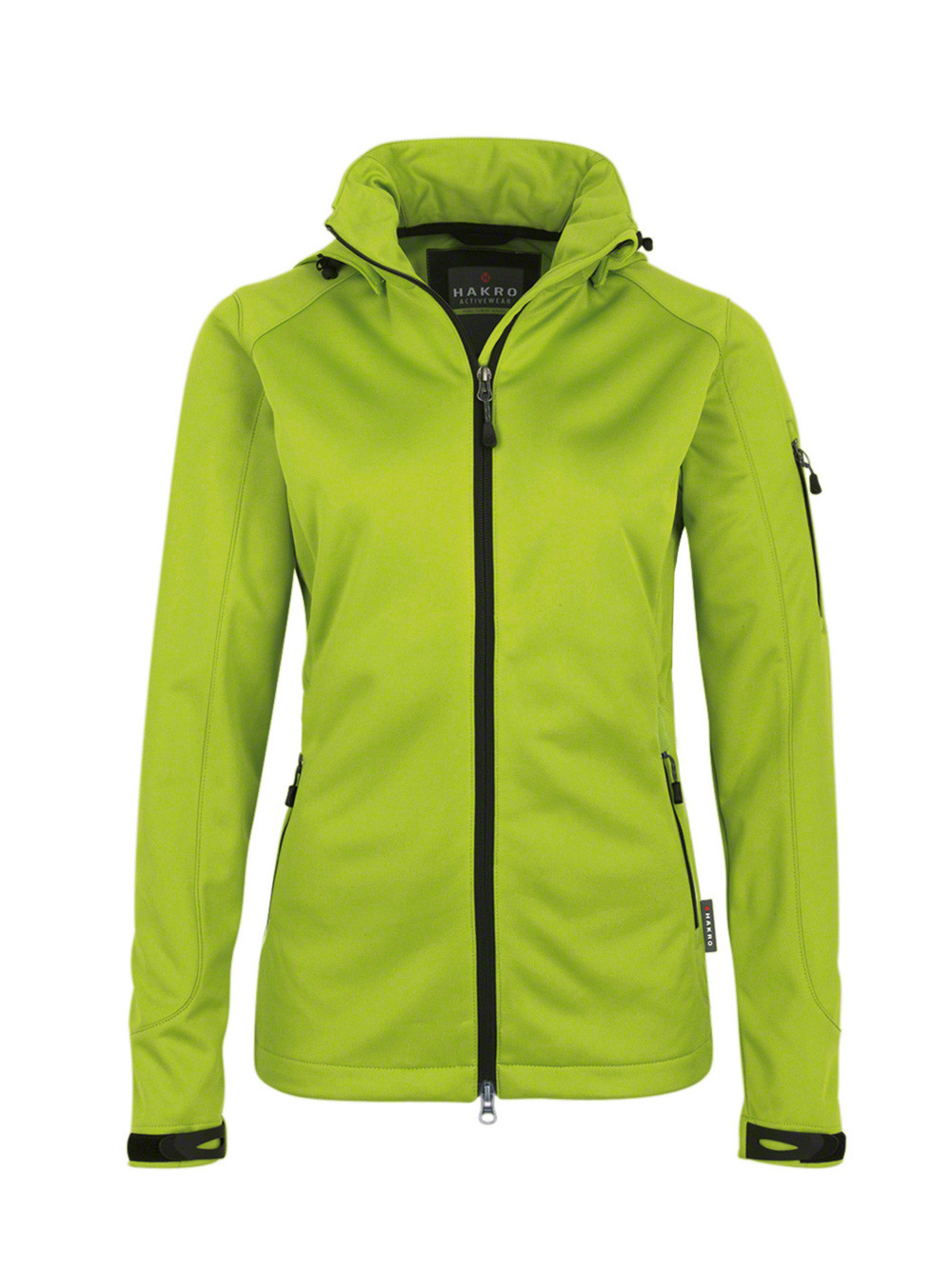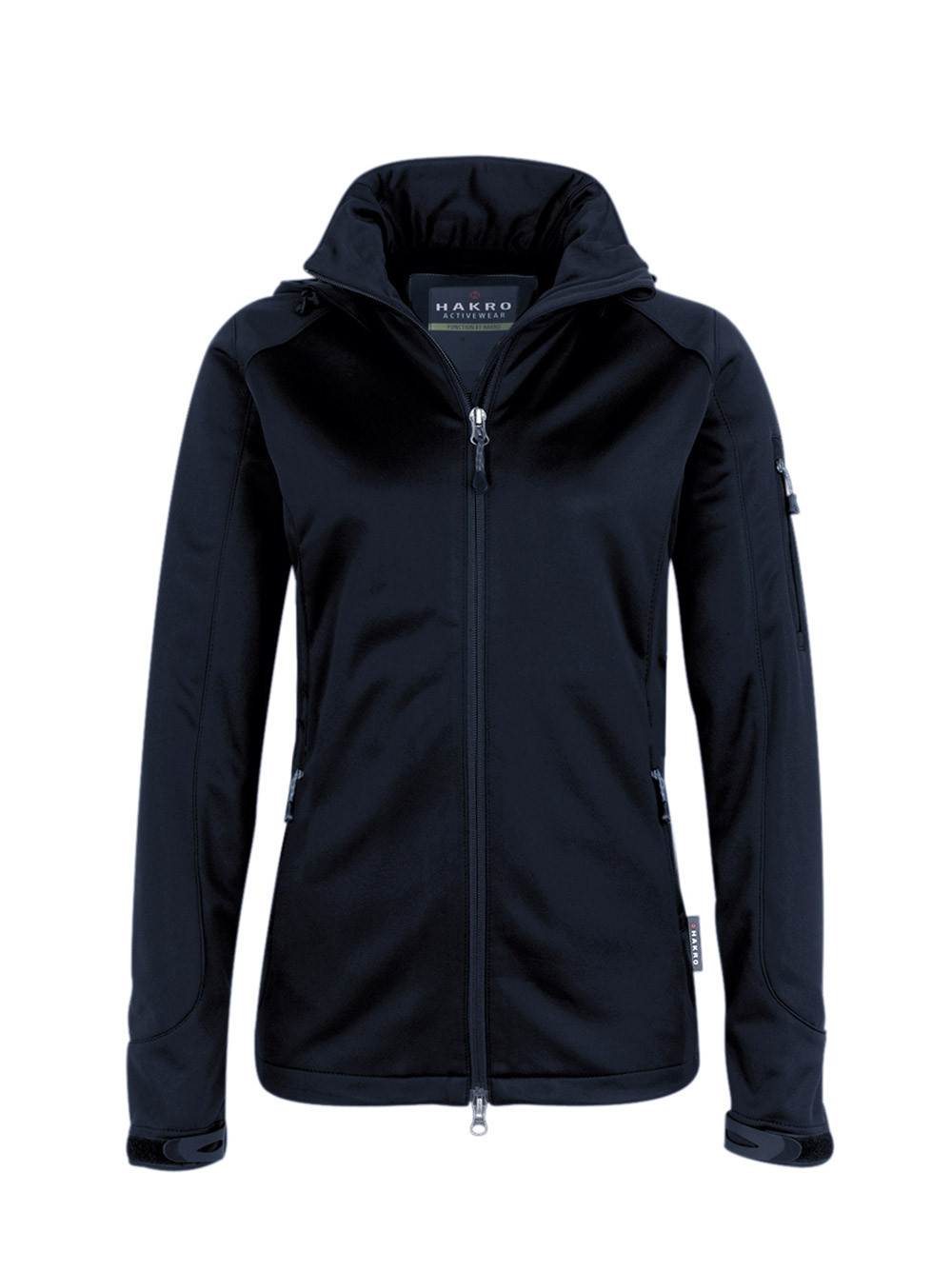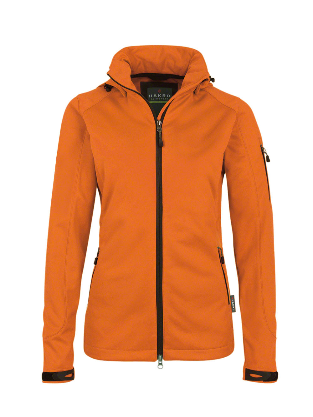 Wärmende, atmungsaktive, strapazierfähige, wasser- und winddichte Softshelljacke für Damen mit abnehmbarer Kapuze, weitenverstellbarem Saumabschluss mit Tunnelkordelzug und Stoppern, verlängertem, abgerundetem Rückenteil, leichtem Microfleece an der Innenseite, Klettbändern an den Ärmelabschlüssen zum stufenlosen Regulieren, hochwertigem 2-Wege-Frontreißverschluss mit innenliegender Windschutzpatte und Kinnschutz, Reißverschlusstasche am linken Ärmel und seitlichen Reißverschlusstaschen. Aus dehnfähigem Softshell-Material hergestellt für exzellente Bewegungsfreiheit aus Interlock-3-Lagen-Laminat mit TRIACTIVE®PRO-Technologie. Gewebtes HAKRO-Flaglabel an der linken Seitennaht.