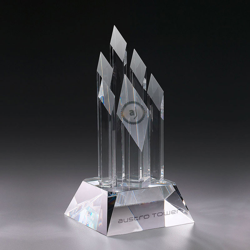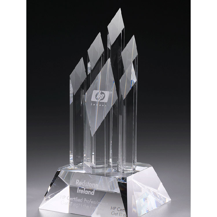 Der Five Crystal Award ist ein Award der Superlative und gehört zu den weltweit besten Award. Die 5 schmäleren rautenförmigen Säulen bilden eine Art Spalier um die massivere Mittelsäule. Die Höhe von 30 cm stellt bereits einen Blickfang für sich dar. Eine Lasergravur auf der Mittelsäule und auf dem Sockel machen diese Auszeichnung zusätzlich zu etwas ganz Besonderem.