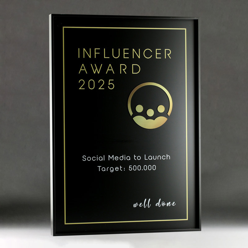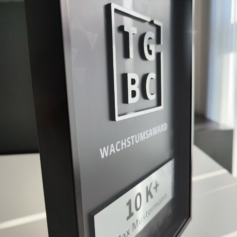Frame Award ist eine individuell gestaltbare Ehrentafel und Auszeichnung, freistehend oder zum Aufhängen. Frame Awards gibt es in A4, A3 oder DIN A2 Format. Die Rahmen der Auszeichnungen bestehen aus hochwertigem Aluminium in Silber oder schwarz Matt wählbar. Das Passepartout mit Druck und 2D Emblemen innen ist frei gestaltbar und das Acrylglas verleiht dieser Ehrentafel freistehend oder an der Wand hängend besonderen Glanz.