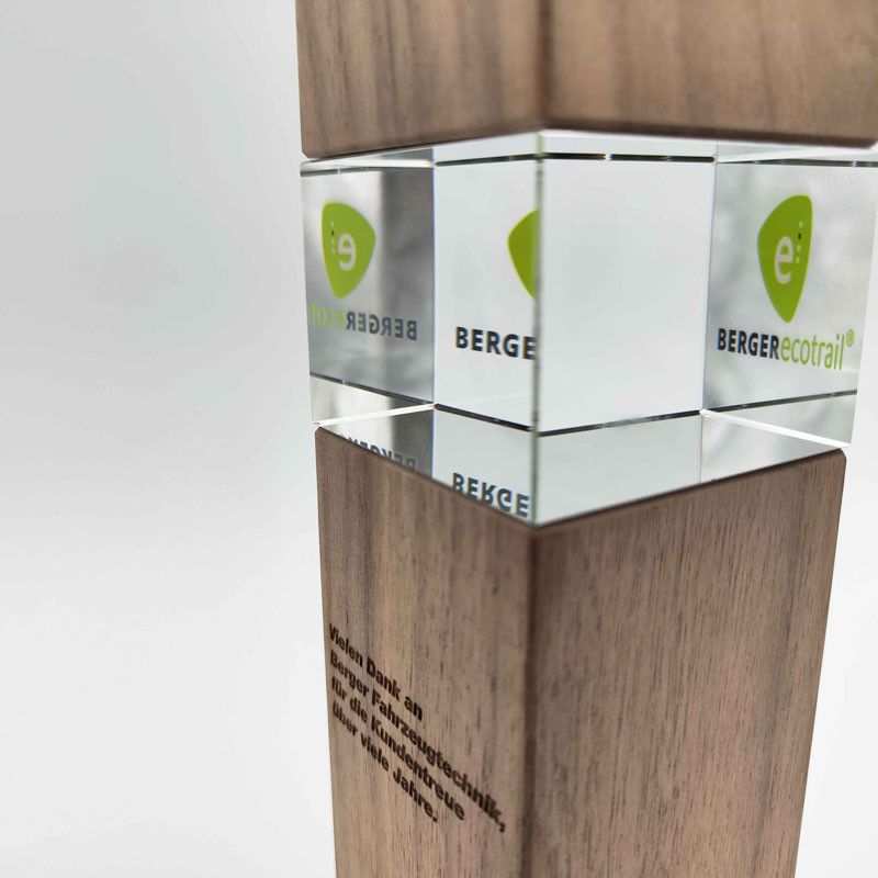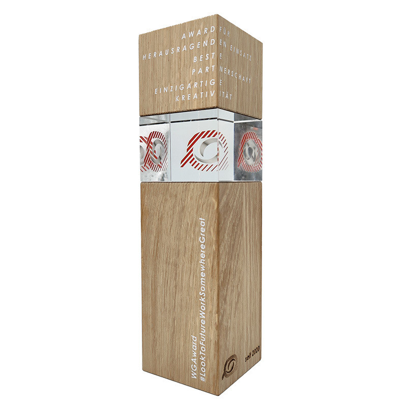 Glas und Holz als Award vereint wie noch nie. In Oberösterreich produziert mit Walnussholz gedämpft oder Eichenholz aus dem Wiener Wald, ist dieser Award ein Highlight aus unserem Sortiment. Mittels Spiegelfolie auf mit dem Holz angebracht, lassen sich Aufdrucke mit einzigartigen Effekt erzeugen.