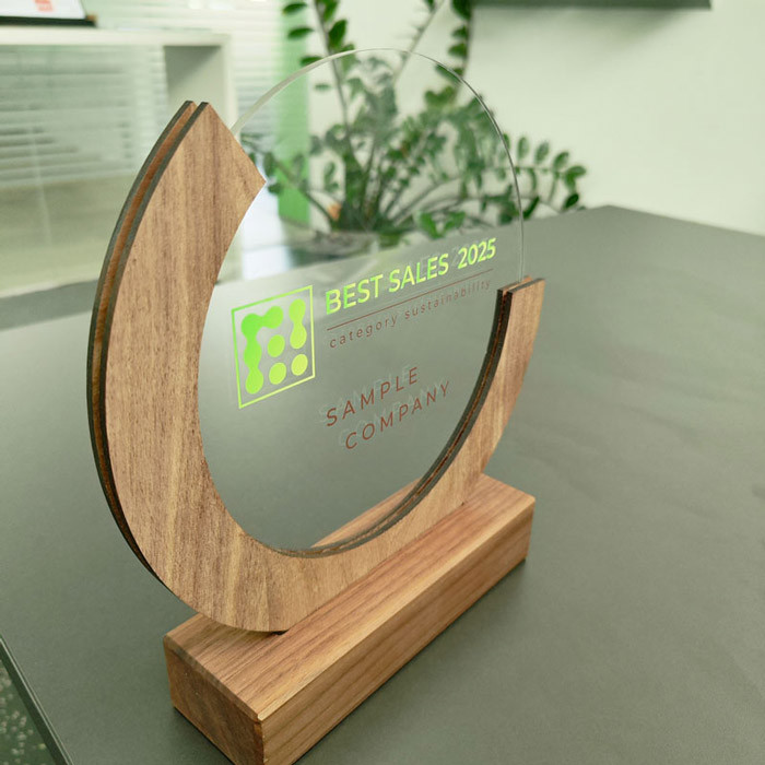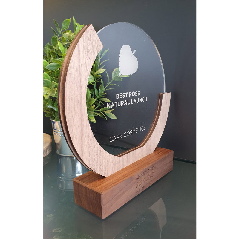 Der elegante und moderne Holz Award Connect, ist eine Kombination aus Holz und Acrylglas. Diese Sonderanfertigung wird aus 3 Platten zusammengefügt. Auf Anfrage gerne auch in anderen Formen und Formaten produzierbar - zum Beispiel die Acrylplatte mit einer Holzplatte ersetzen.
