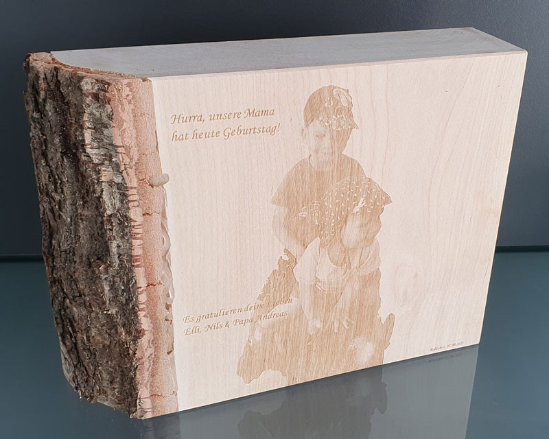 - Material: Buchenholz mit echter Rinde auf einer Seite