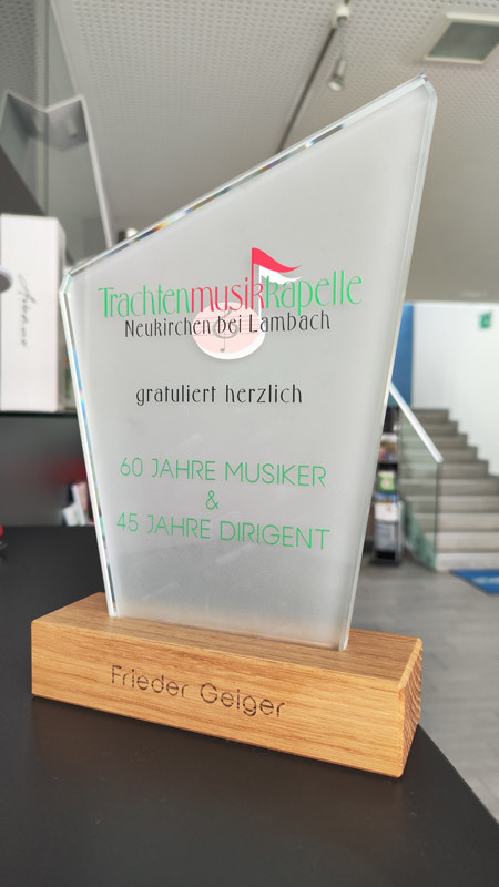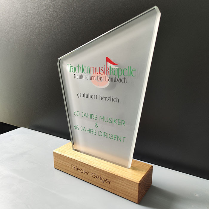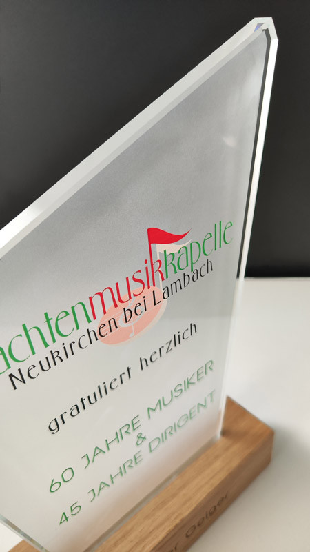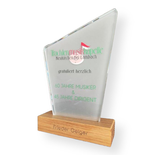 - Druck auf einer Seite des Glaselements inkludiert; Gravur am Sockel mit Aufpreis möglich