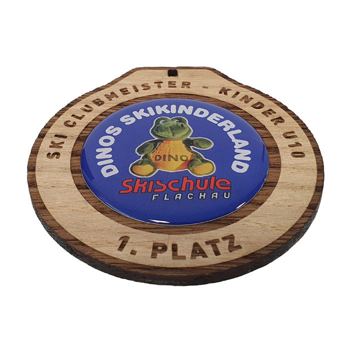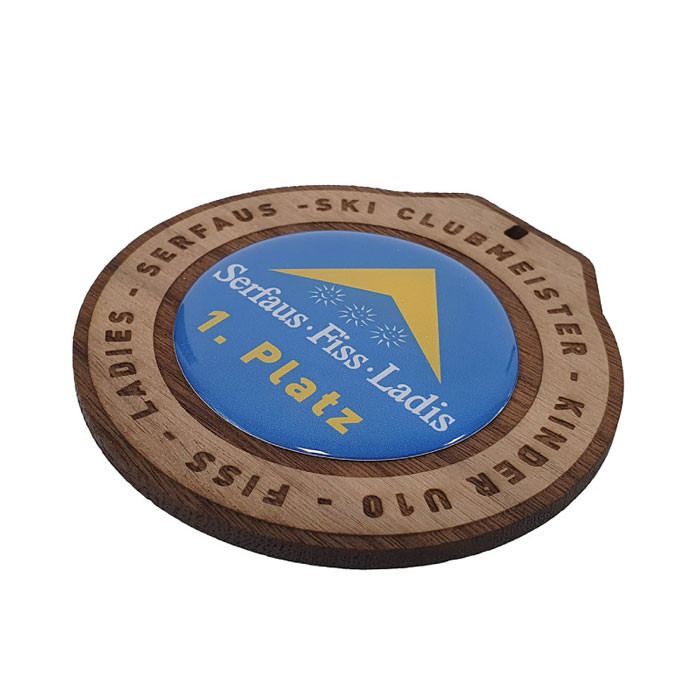 Diese Holzmedaille aus nachhaltigem 3,5 mm starkem Vollholz aus Österreich können Sie nach Ihren Wünschen ganz individuell gestalten: 4-farbiger Druck in der Größe von 45 mm Durchmesser kombiniert mit Lasergravur am äußeren Rand der Holzmedaille.