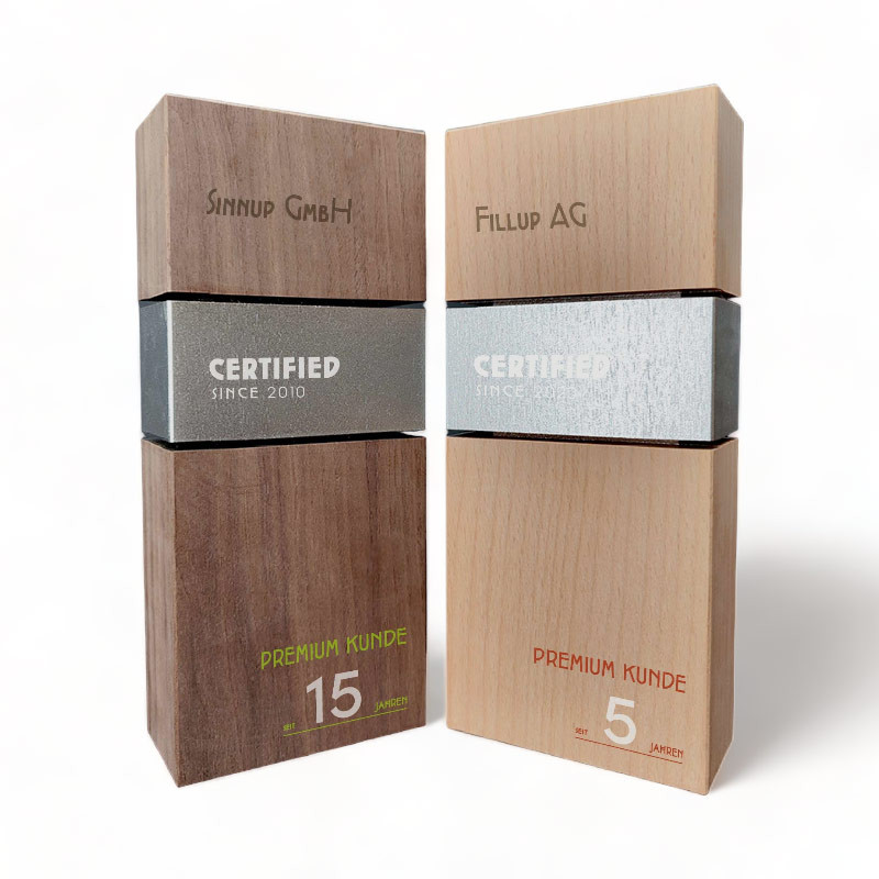 Diese Holztrophäe im rechteckigen Format bietet größere Flächen für die Gravur oder den Druck. Aus nachwachsenden Rohstoffen gefertigt, passt der Award perfekt für Ehrungen und Verleihungen, die auch Naturverbundenheit ausstrahlen wollen. Wir veredeln die Holztrophäe in unserer eigenen Produktion in Kallham ganz nach ihren individuellen Wünschen. Wählen Sie die Veredelung mittels Druck für einen Farbtupfer oder Lasergravur, um die natürliche Beschaffenheit und Eleganz zu bewahren.