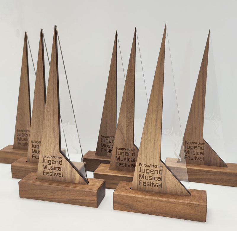 - Lasergravur auf dem Holzsockel als auch auf dem Holz- oder Acrylglas Oberteil. (max. auf 2 Positionen)