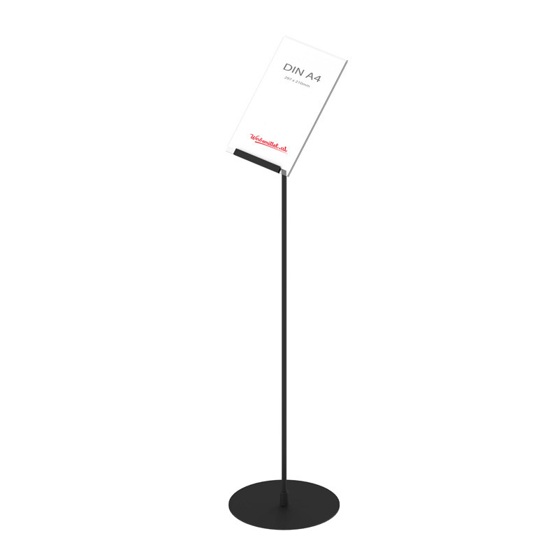 Infoständer aus hochwertig verarbeitetem Metall in schwarz beschichteter Ausführung. Auf Anfrage auch modular veränderbar mit anderen Sockeln, Ständern oder Aufsätzen. Einfacher, werkzeugfreier Plakatwechsel - Ideal für Kunden- und Gästeinformation in Hotels, Gastronomiebetrieben und im Handel.