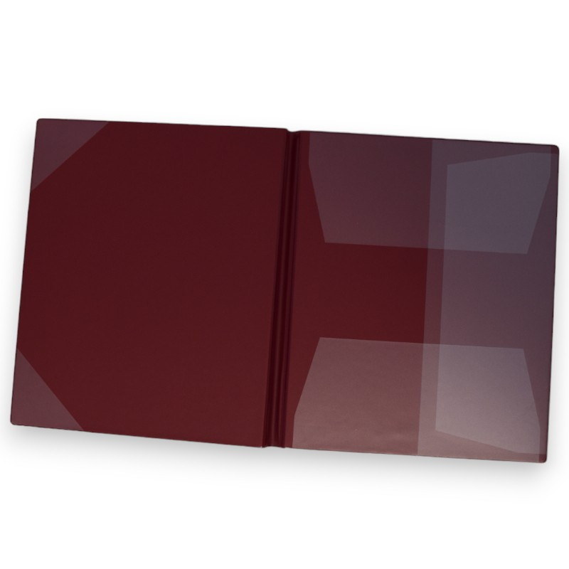 - Ausstattung der Mappe: Namensfenster auf der Vorderseite, Clearflügeln und Clearecken auf der Innenseite