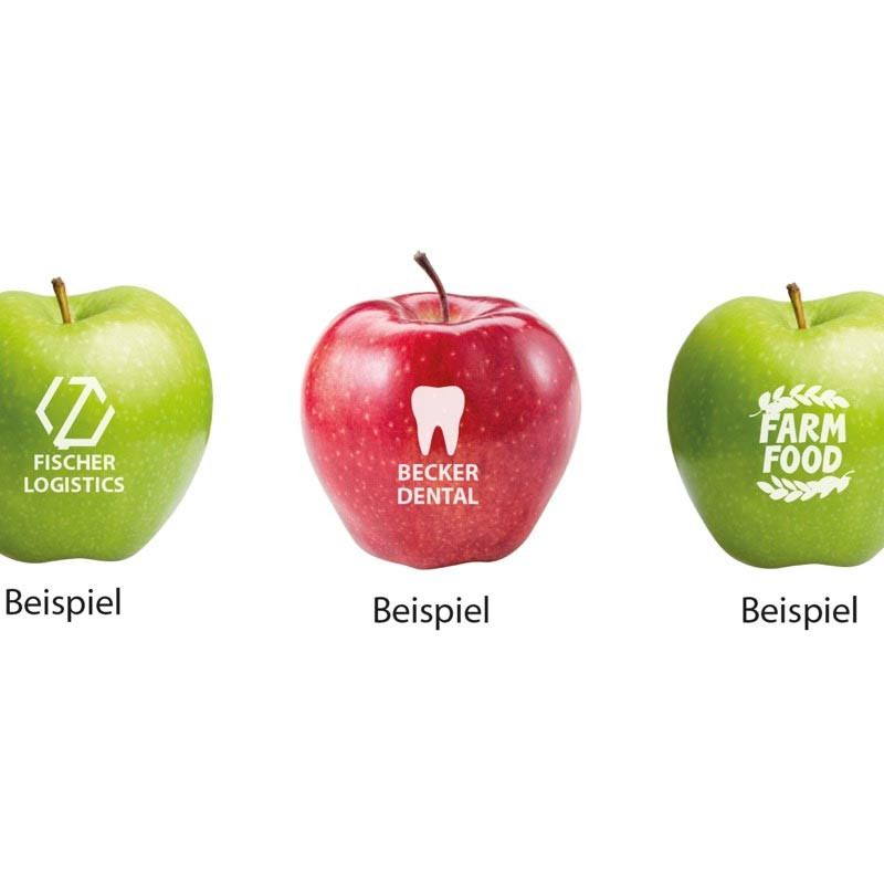 Der rote oder grüne Qualitätsapfel wird in einem schonenden Druckverfahren mit Ihrem Logo bedruckt.