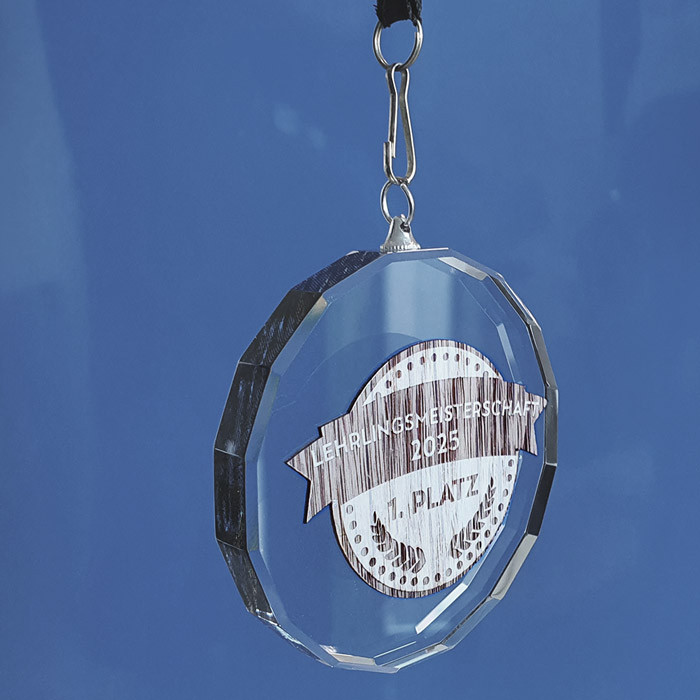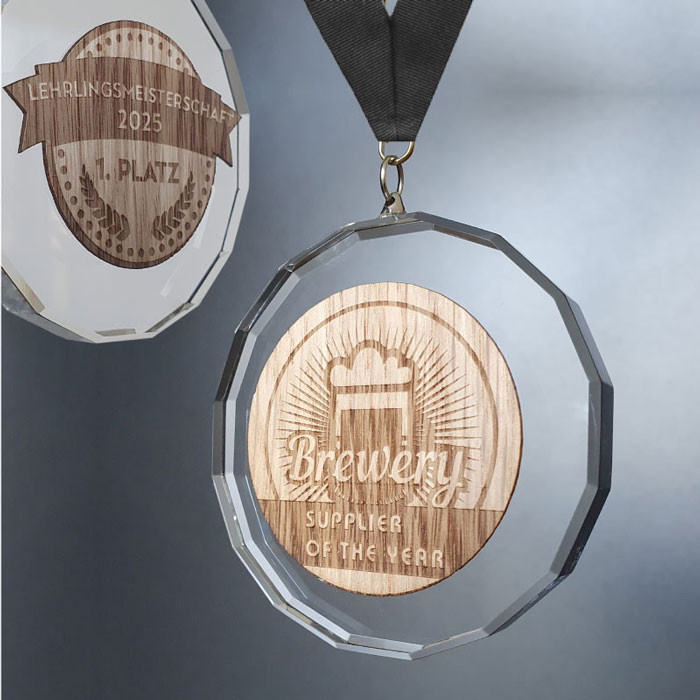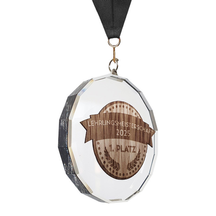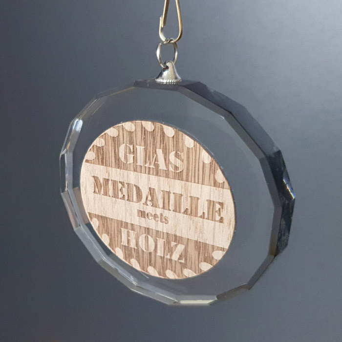 Diese Glas Medaille aus Kristallglas wird einzeln in Geschenkboxen geliefert. Durch die edle Verarbeitung mit Fasungen an den Kanten ist die Medaille Finn ein Produkt der Oberklasse. Veredelt durch ein Holz Emblem in der Stärke von 0,6 mm mit Ihren Wunschmotiven ist das Produkt außerdem ein nachhaltiger ausgefallener Hingucker für jede Veranstaltung.