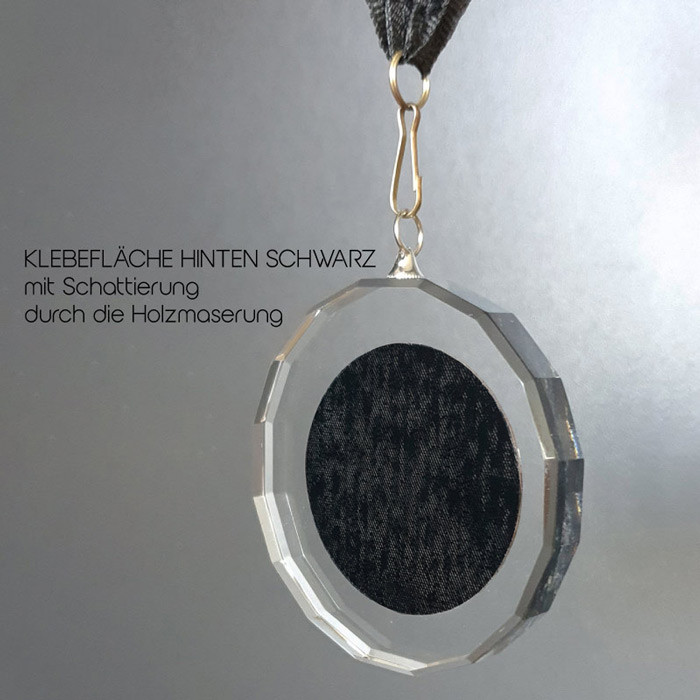- Beachten Sie: Das Holzemblem wird auf dem Glas verklebt. Auf der Glasrückseite können in der Klebefläche durch die Holzmaserungen Schattierungen in der Klebefläche sichtbar sein. Beachten Sie dazu das Detailbild von der Rückseite.