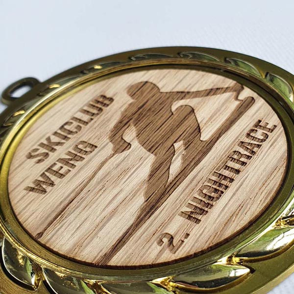 Medaille Marie ist eine Kombination aus Holz und Aluminium. Die Medaille ist mit ihren matten und glänzenden Elementen sehr wertig. In Kombination mit einem Eichenholz Emblem wird diese Medaille zum begehrten Highlight Ihrer Veranstaltung.