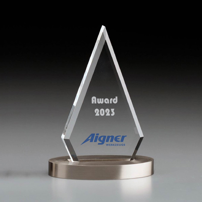 Abgeschrägte, diamantpolierte Kanten verleihen diesem Award die Optik einer gläsernen Pfeilspitze. Der Metallsockel mit Edelstahlcharakter gibt der Trophy den letzten Schliff.