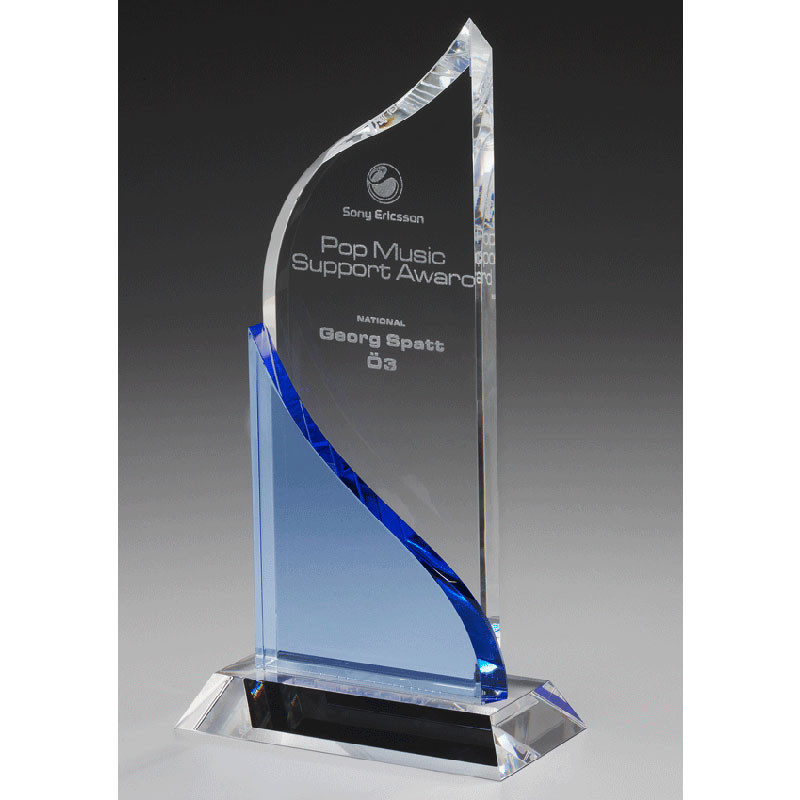 Zweifarbiger Kristallglasaward mit elegant geschwungenen Glaselementen. Die versetzte Schwingung verleiht dem Nobel Award die besondere optische Wirkung.