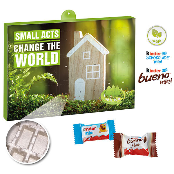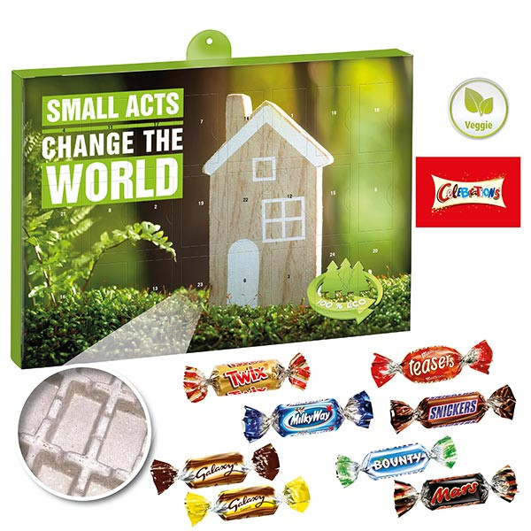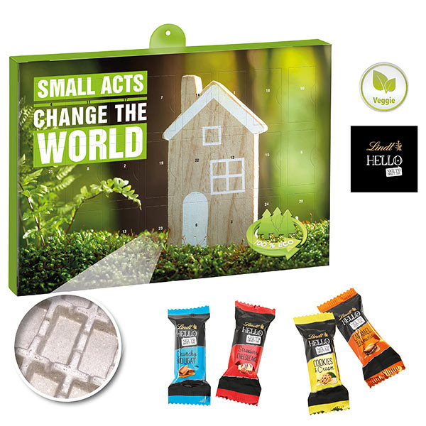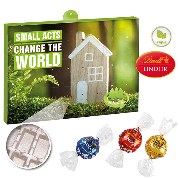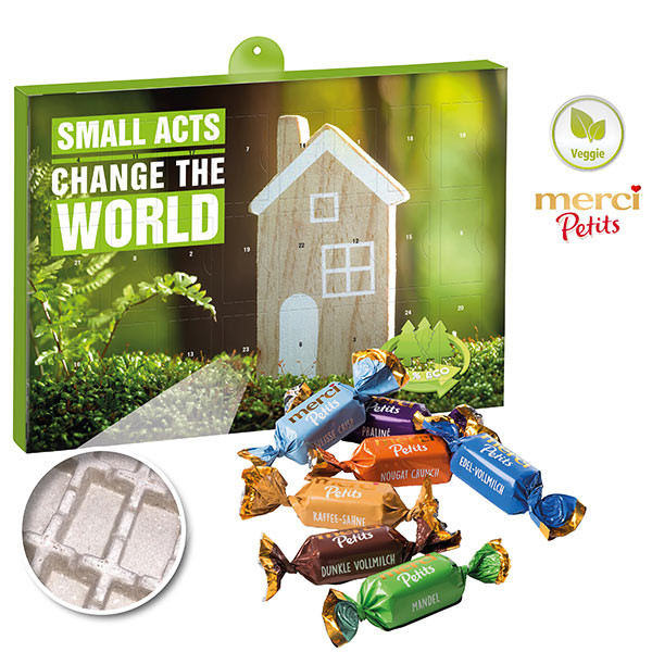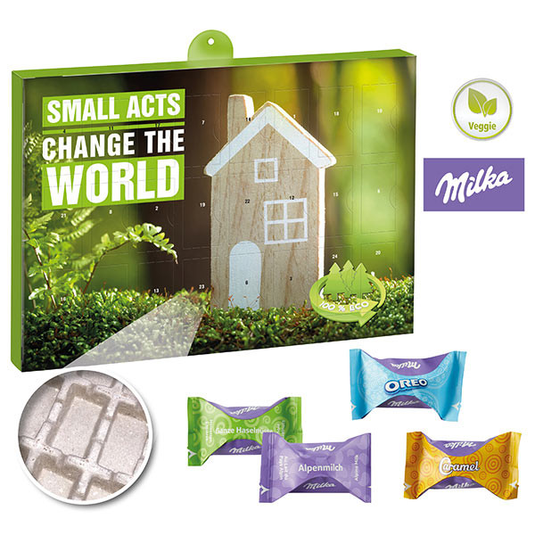 Dieser Wand-Adventskalender im Querformat besteht aus stabilem zu 100 % recyclebarem Kalender-Inlay aus gepresster Altpapierpappe. 24 Türchen sortenrein gefüllt mit Schokolade oder Pralinen. Adventskalender-Kartonage und Kalender-Inlay zu 100 % recyclebar im Papierkreislauf.