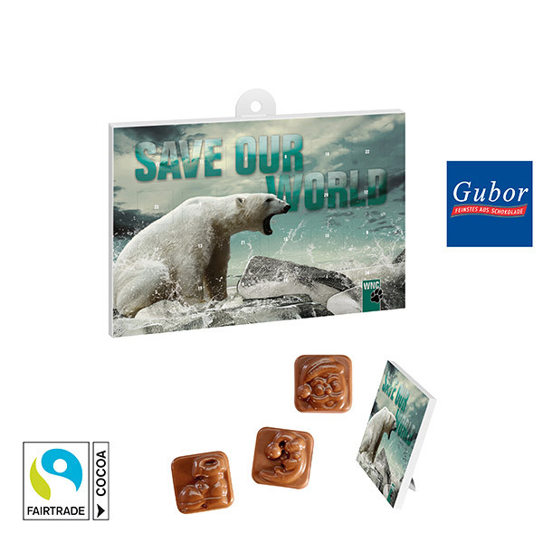 Individuell bedruckbarer Tisch- oder Wand-Adventskalender im Querformat mit stabilem Tiefziehteil. Die 24 Türchen sind mit Vollmilchschokolade befüllt, welche mit Weihnachtsmotiven versehen sind. Mit jedem gekauften Kalender spenden Sie automatisch 1 Cent für World Vision Projekte. Vollmilchschokolade mit mindestens 30 % Kakao (Fairtrade-Kakao mit Mengenausgleich.)