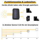 - Aufladen auch über die Steckdose oder den PC möglich, wenn die Sonne nicht scheint
