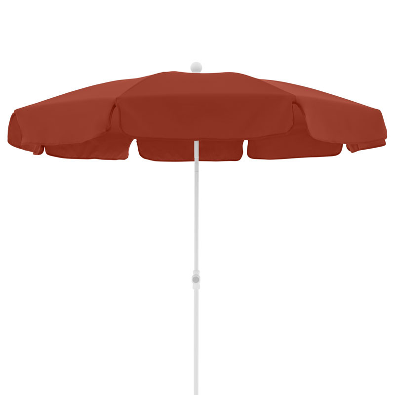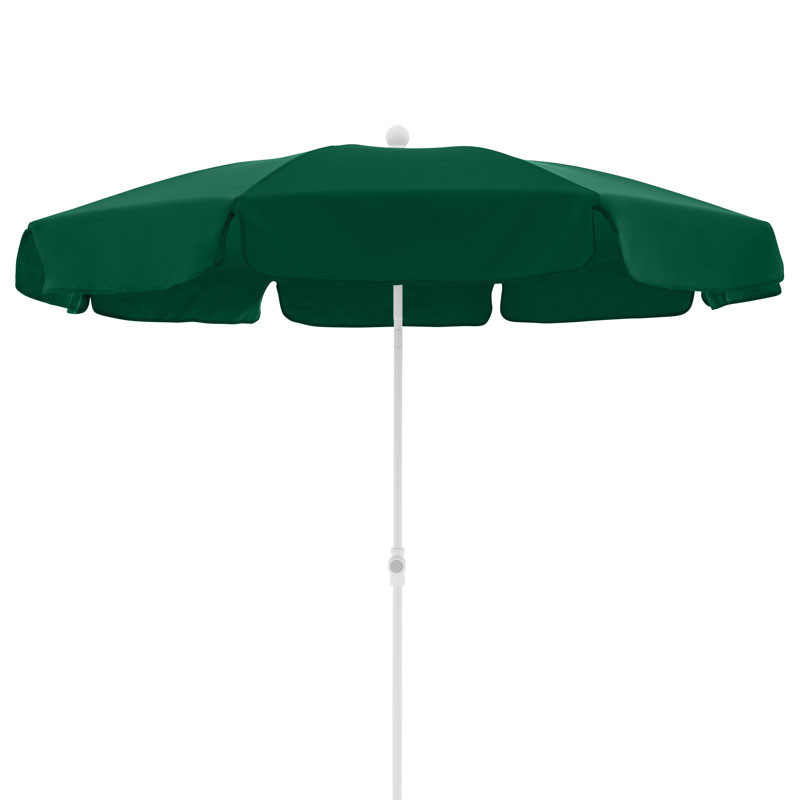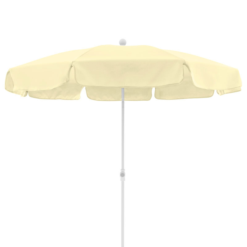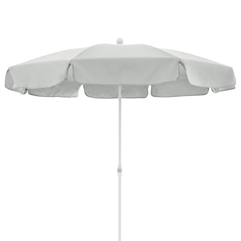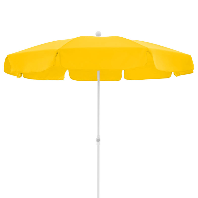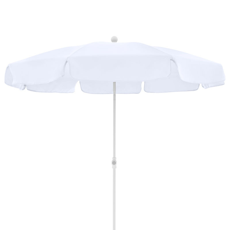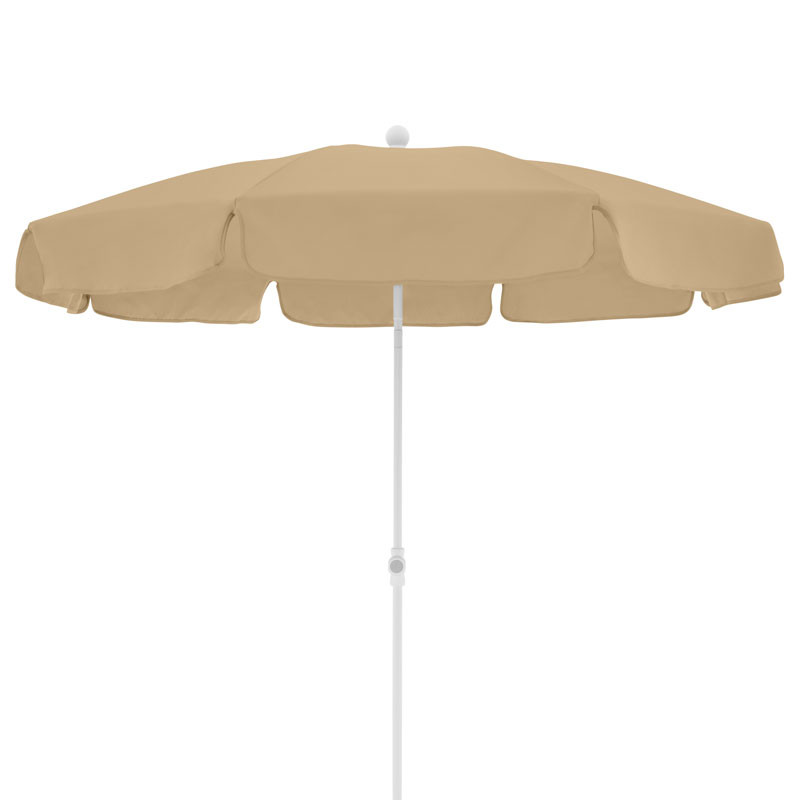 Dieser Sonnenschirm mit einem weiß pulverbeschichteten Gestell ist mit 3,8 mm starken Federdrahtschienen ausgestattet. Das Unterrohr verfügt über einen Drehfeststeller. Das Polyester-Gewebe der Schirmbespannung ist licht- und farbecht nach DIN Note 6 und weist einen Lichtschutzfaktor von 80+ auf.