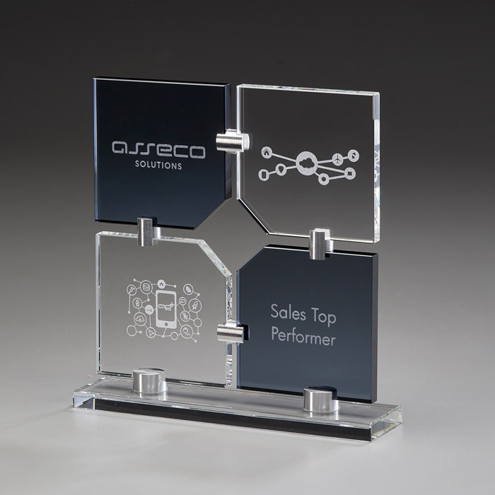 Dieser Award steht für erfolgreiche Kooperation und Zusammenarbeit. Diese besondere Optik wird mittels 4 verbundenen Glasfeldern - in 2 unterschiedlichen Farben - erzielt. Ideal als Symbol der Anerkennung für Prozesse und Zusammenarbeit.