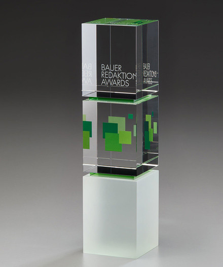 Dieser Glasaward aus 3 Elementen überzeugt durch seine Eleganz: Die Basis bildet das sandgestrahlte Ice-Element. 2 klare Kristallglaselemente sind darüber posiitioniert und mittels 4 mm starken grünen Kristallglasstücken miteinander verbunden. Ab 5 Stück kann eine andere Grundfarbe für die farbliche Absetzung gewählt werden. (Bitte vermerken Sie dies im Kundenkommentar vorm Absenden Ihrer Bestellung)