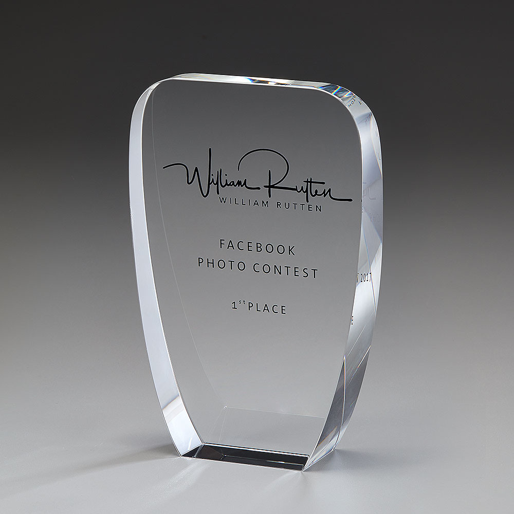 Die außergewöhnliche Form dieser schlichten Glastrophäe strahlt besondere Wertigkeit aus. Das Kristallglas ist bis zu 50 mm dick und von höchster Qualität. Lasergravur oder farbiger UV-Druck kommen durch die große Fläche und die abgerundete Form besonders schön zur Geltung.